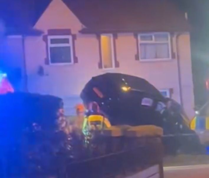 Photos from the scene show what looks like a collision between a police van and car with the car impaled on the fence of a garden wall of a domestic property.