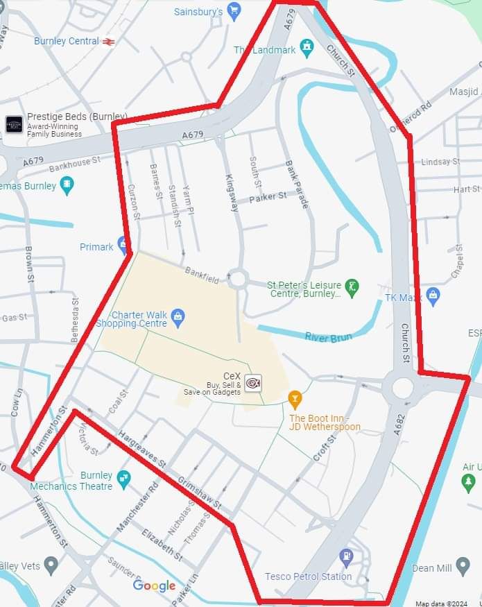 “Please be aware that dispersal powers under Section 35 of the Anti-Social Behaviour, Crime & Policing Act 2014 have been authorised in the BURNLEY TOWN CENTRE & BUS STATION areas between 19:00, 02/04/2024 & midnight tonight as shown within the attached map.