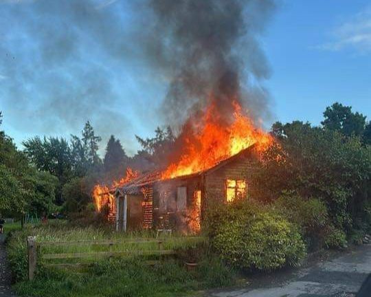 “At 20:22 on the 15th June 2024, four fire engines from Nelson, Burnley and Colne are in attendance at a derelict building fire on Hollins Road, Barnoldswick. Firefighters are wearing breathing apparatus and using three hose reel jets to extinguish the fire.