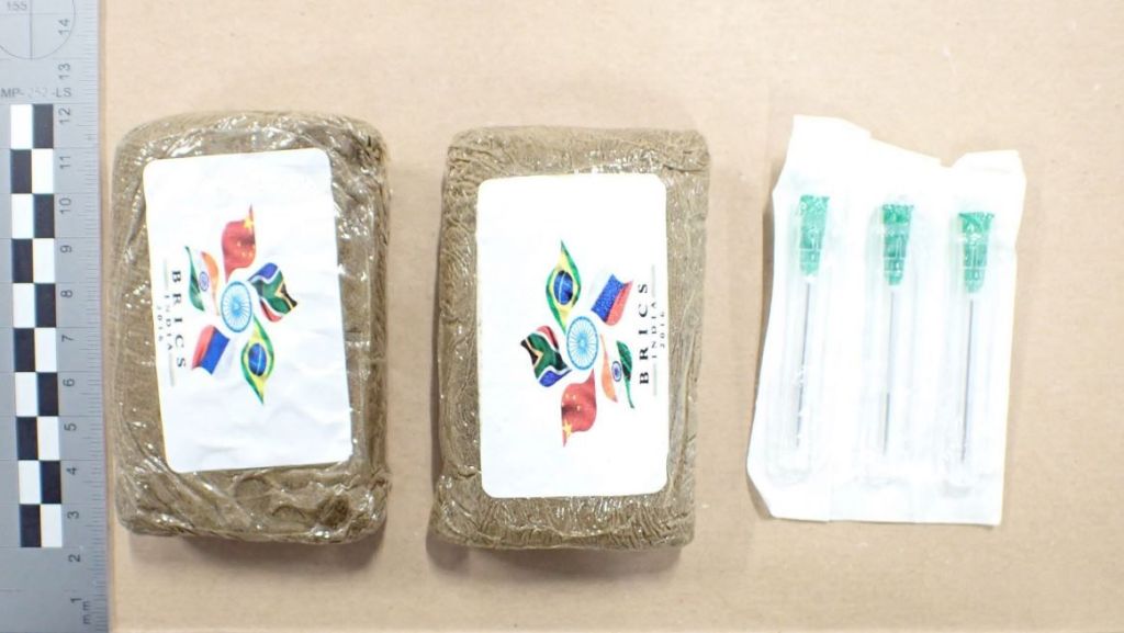 Within the car, packages containing a combination of tablets, cannabis resin, mobile phones, and syringes – many of which were wrapped in vacuum or cellophane packaging. In addition, a lock-knife and bag of white powder were discovered, resulting in their arrest.