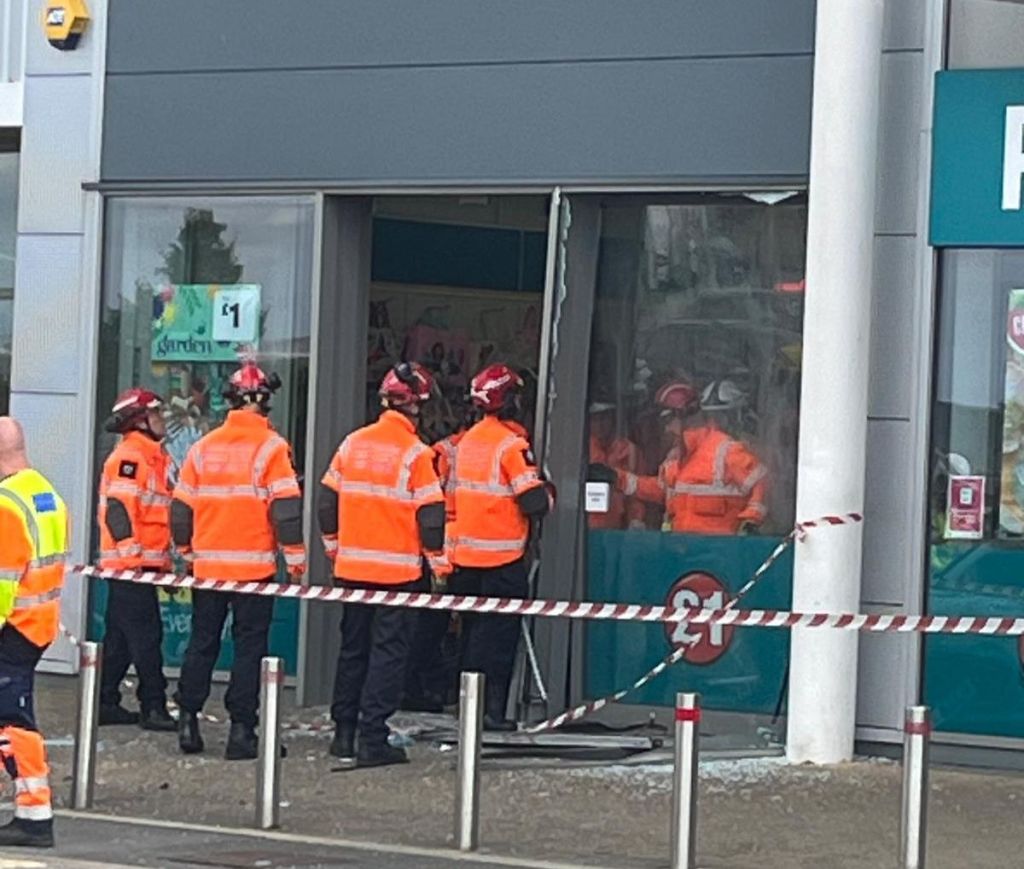 Images from the scene show a car that appears to have crashed through the metal barriers and into the window at the front of the store. A large emergency presence could be seen at the scene as shocked shoppers looked on.