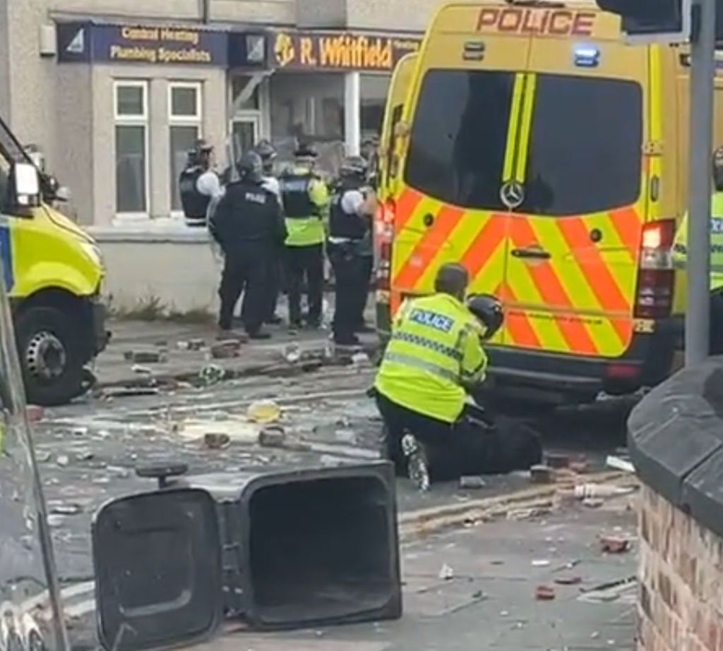 Footage widely shared online shows officers under attack with objects, including bricks, bins, and fireworks thrown at officers.