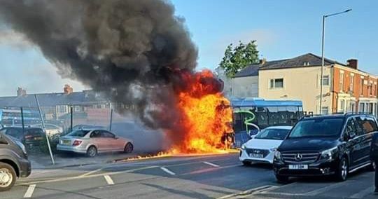 The bus believed to be from Preston Bus Ltd was well alight when emergency services attended the scene.