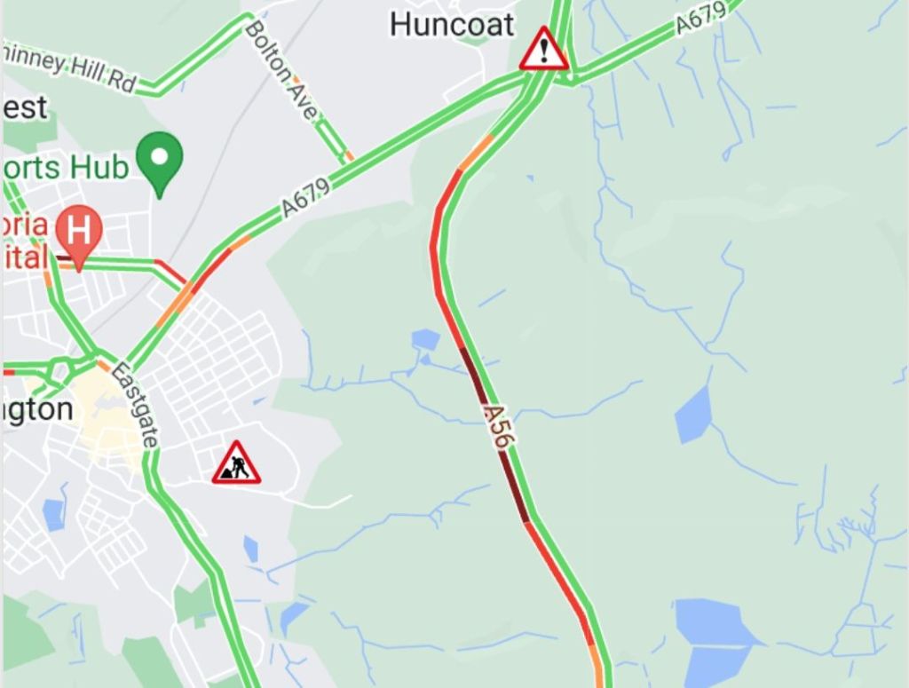 “Partially blocked and slow traffic due to crash on A56 Northbound from A680 Blackburn Road (Rising Bridge Roundabout) to the A679.”