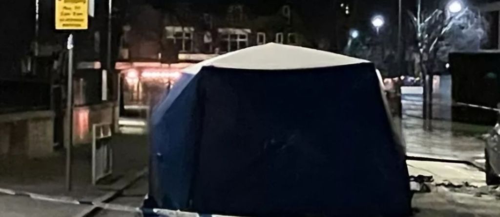 A large police presence can be seen in the area around Nicolas Road and Oswald Road, with a cordon in place around the scene. A tent has also been erected on Oswald Road.