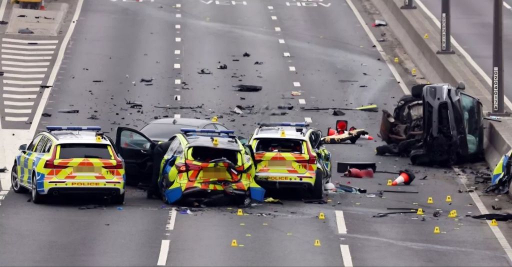 The severity of the collision is evident in images emerging from the scene, which show multiple police vehicles sustaining significant damage.